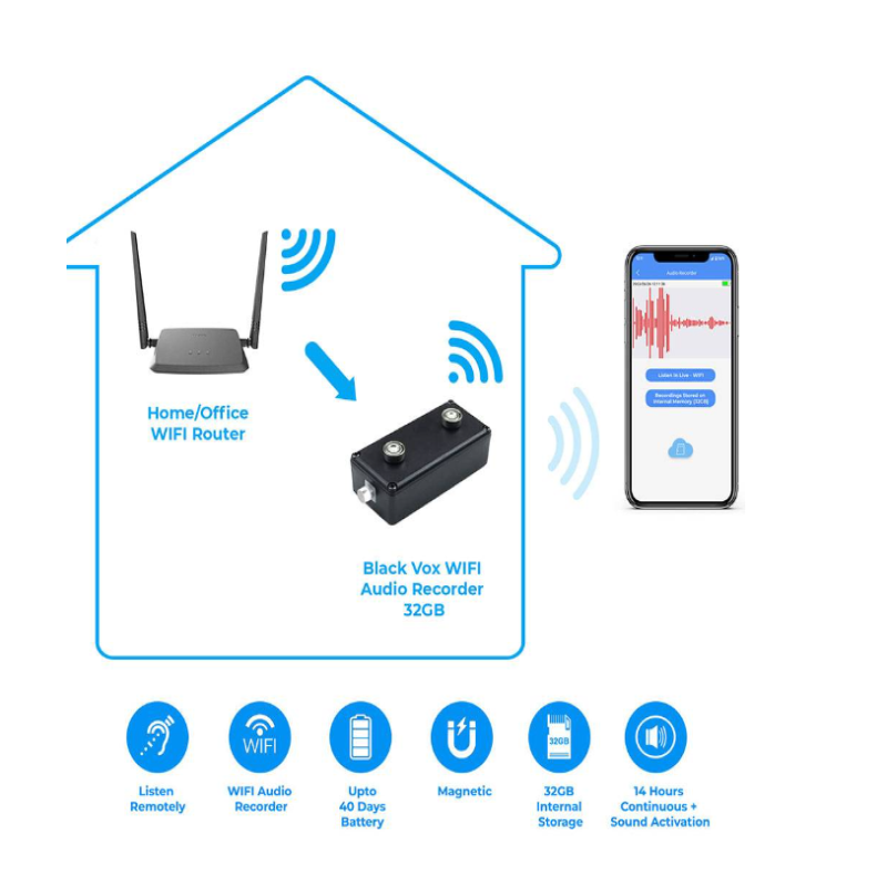 Secure Black Vox WIFI 32GB Audio Recorder, listen, download and configure device directly from App.