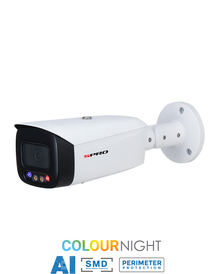 Stop crime in its tracks with the SPRO 5MP IP Fixed Lens Bullet Camera. Featuring red and blue flashing lights, 2-way audio, and pre-recorded messages, it's designed to deter potential criminals. Plus, with ColourNight technology, you'll have full-color images even in the dark.