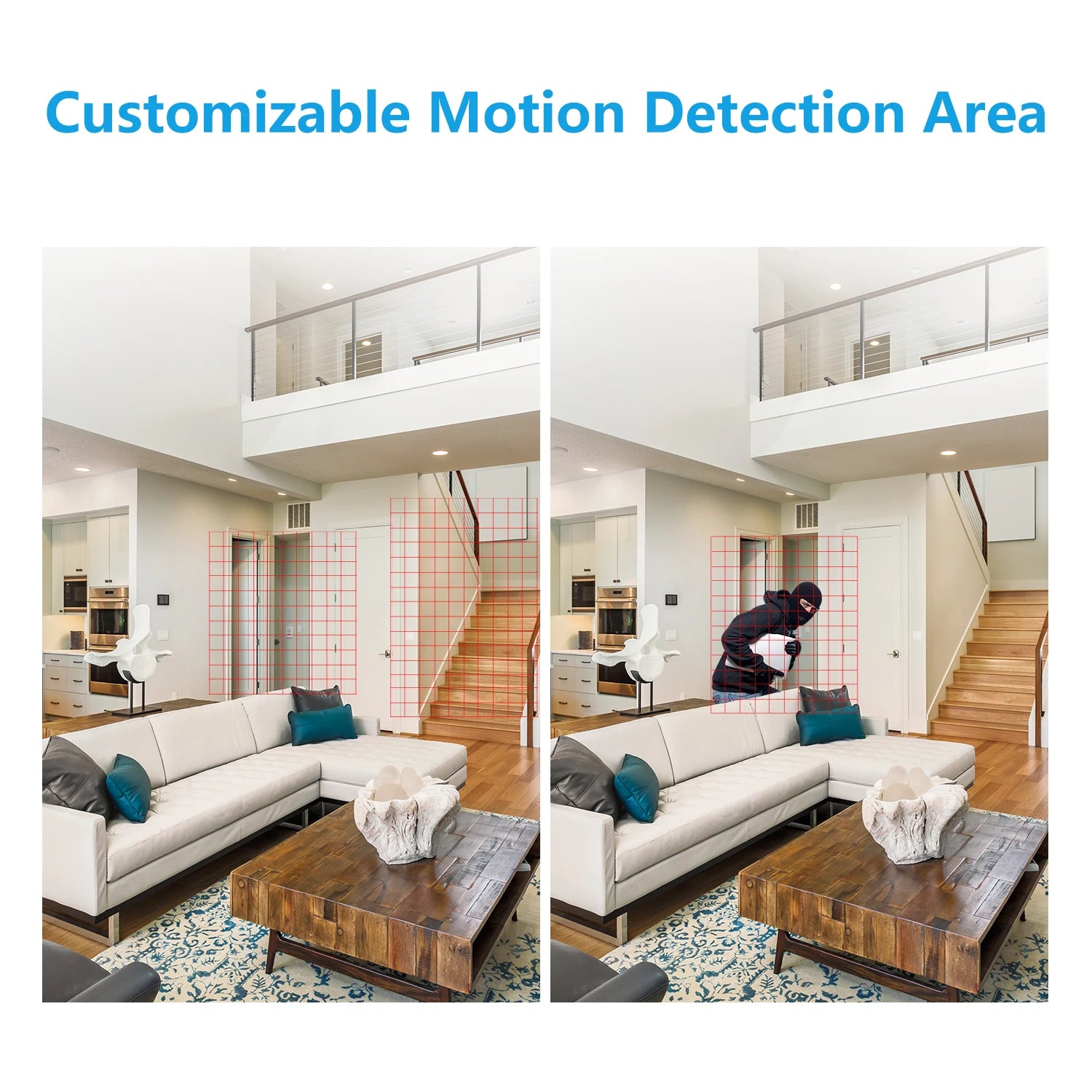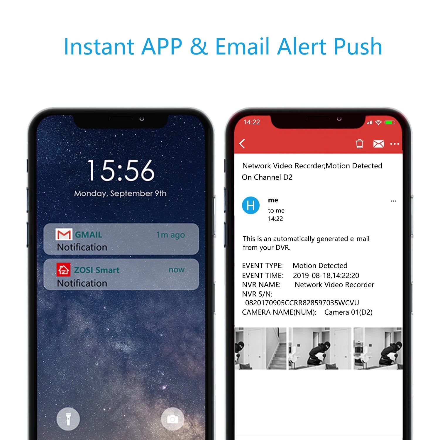 Detect moving objects and trigger alerts when dangers occur. You will receive instant alerts in forms of emails, App push notifications and buzzer alarms in the DVR when invasion happens. You can also set up specific motion zones and adjust the sensitivity to reduce unnecessary false alarms.